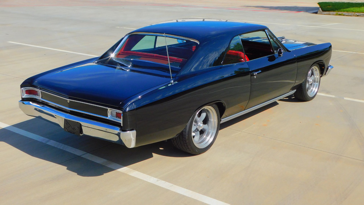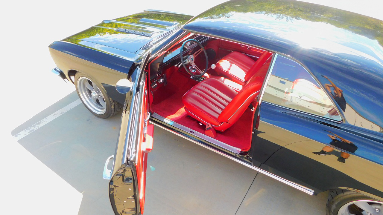 1966 Chevrolet Chevelle, a classic American muscle car that exudes timeless style. This Chevelle features a black exterior that complements its red interior, creating a visual contrast that turns heads wherever you go.